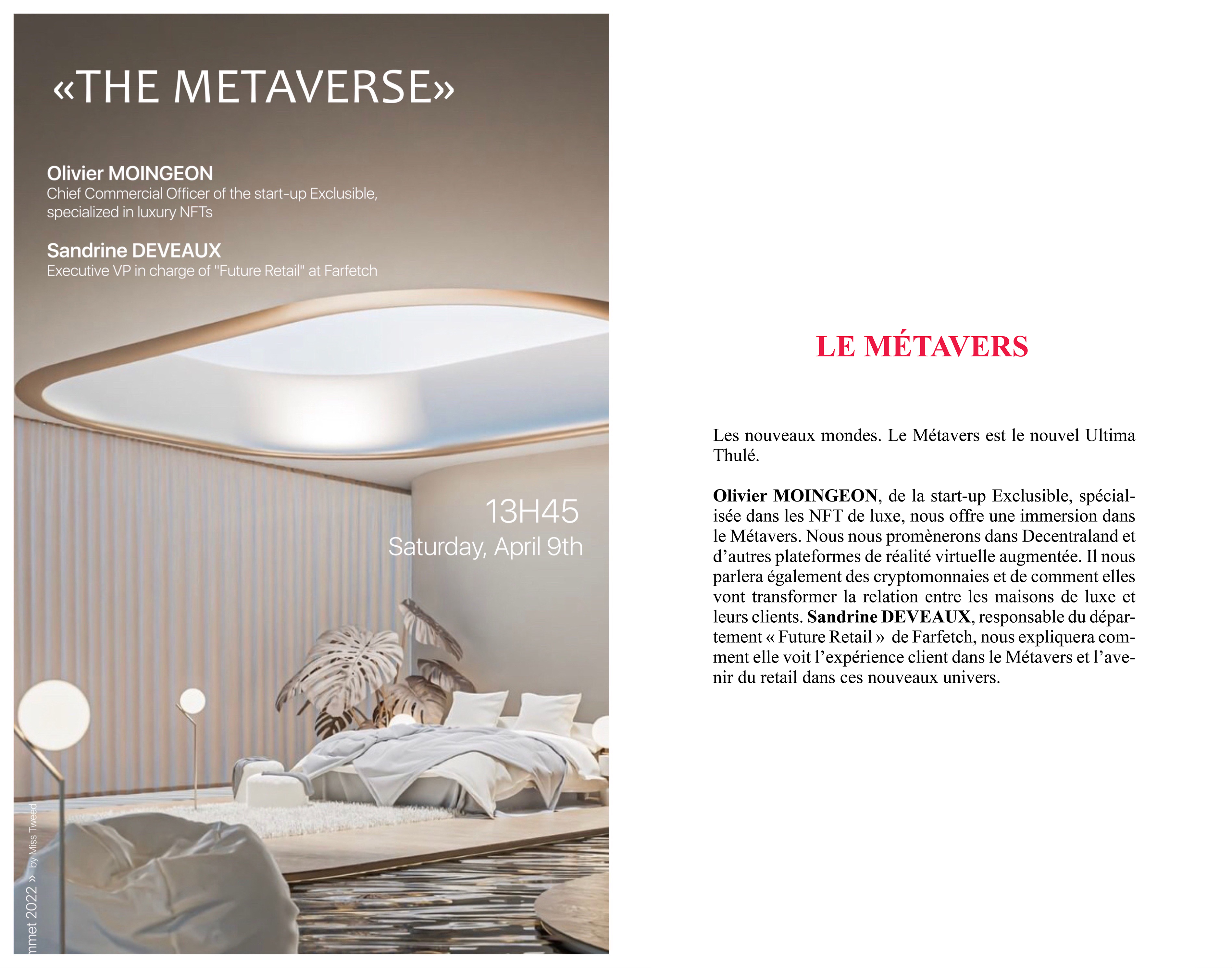 Olivier Moingeon, directeur commercial d'Exclusible , une start-up spécialisée dans les NFT de luxe, a expliqué que les marques essayaient encore de comprendre comment construire leur présence dans le Métavers et n’avaient pas encore de stratégie claire. « L'année 2022 est celle où les marques vont tester les eaux du web3. C'est en 2023 que nous verrons des investissements significatifs de la part des maisons de luxe dans des expériences dans le Metaverse et des projets NFT, qui sont les deux faces d'une même pièce », a déclaré Moingeon.